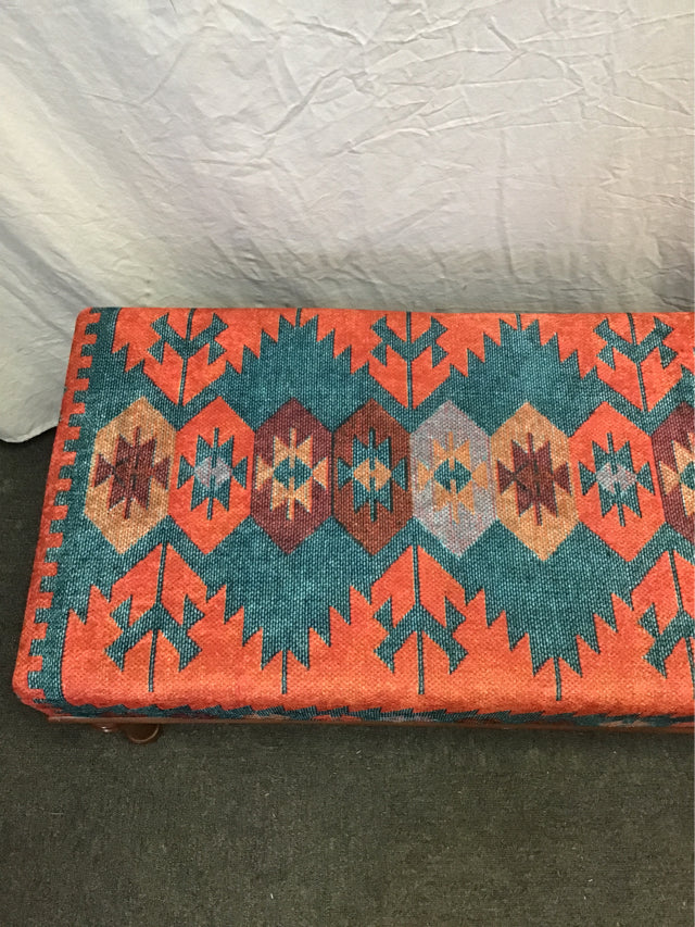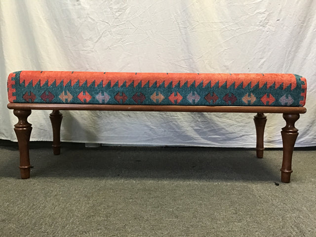 Modern Blue & Orange Upholstered Dining Bench w/ Medium-Stained Wooden Base (48"W x 18"D x 18"H)