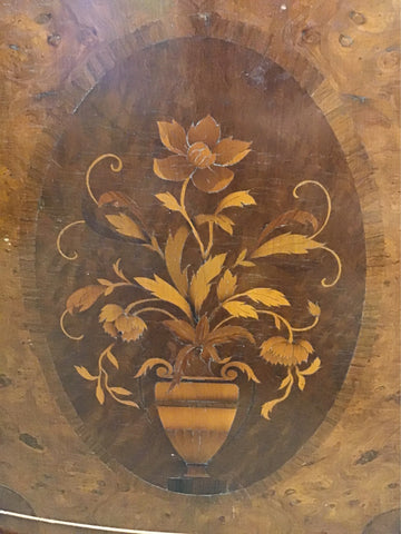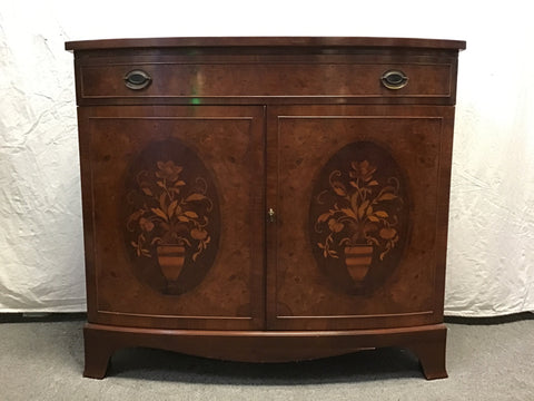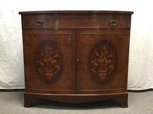 Vintage Mixed Birdseye Maple & Walnut Veneers Bow-Front 1-Drawer Buffet w/ Cabinet & Floral Inlaid Wood Design (38"W x 19"D x 34"H)