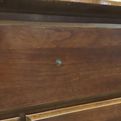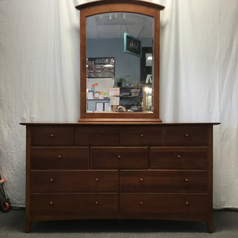 Vintage Mission Thomasville "Impressions" Medium-Stained Solid & Veneer Cherry 9-Drawer Dresser w/ Attached Mirror [See: Light Wear & Missing Pull] (64"W x 19"D x 36"/82"H)
