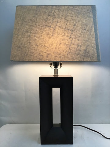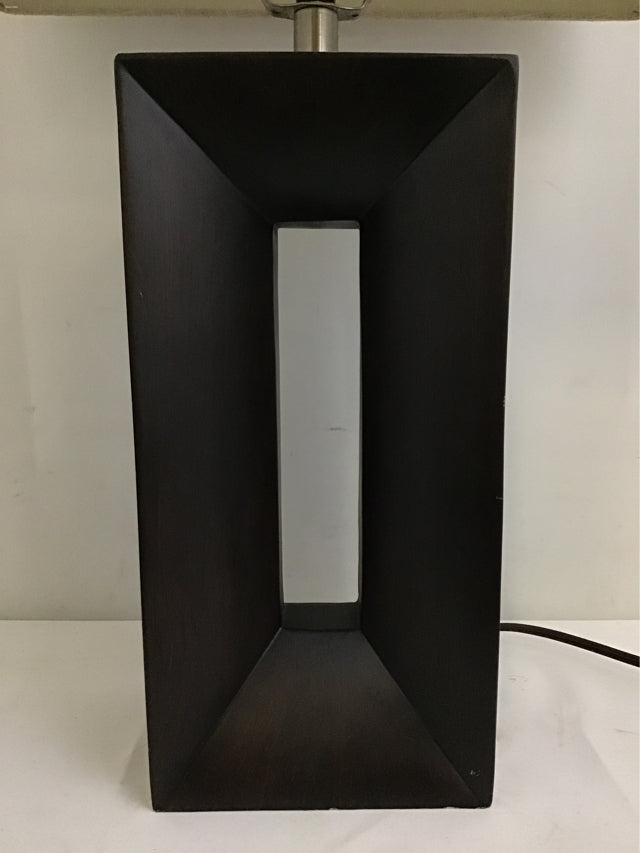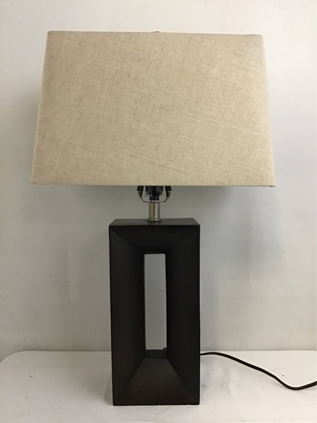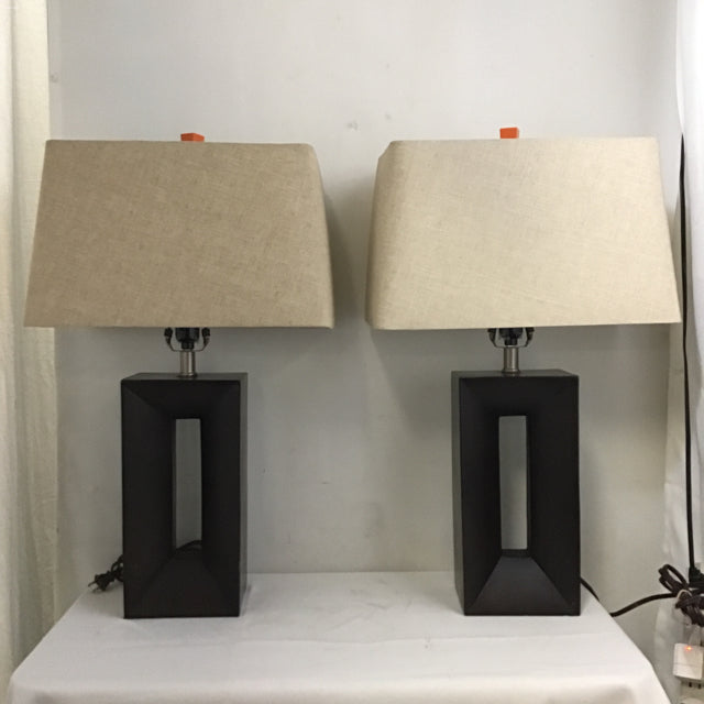 Pair of Modern Brown Ceramic Table Lamps w/ Tan Rectangle Empire Shades (17"W x 10"D x 28"H)
