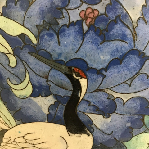 Vintage Chinese Handmade Blue & White Cranes Enameled Brass Cloisonne Ginger Jar w/ Lid & Solid Wood Stand (11"W x 11"D x 14"H)
