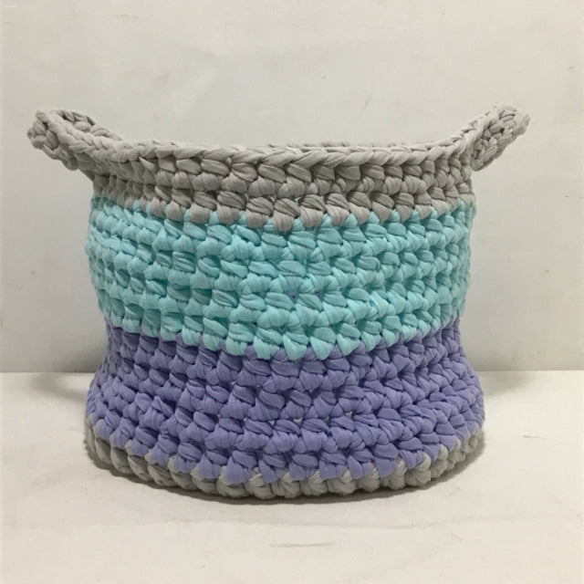 Sarahjane Harrigan Medium Grey, Aqua, & Purple Crocheted T-Shirt Yarn Basket (9"W x 9"D x 7"H)