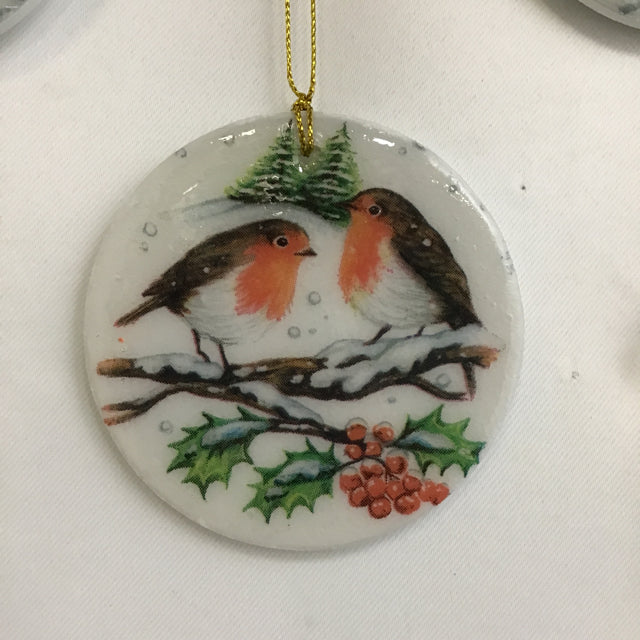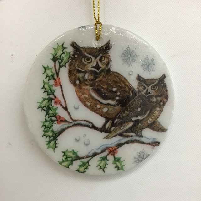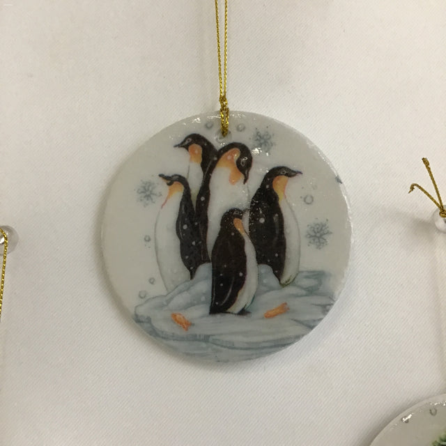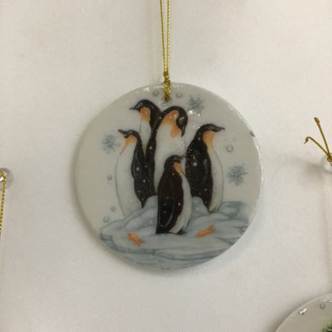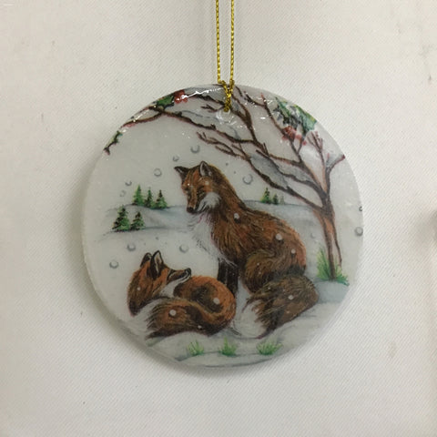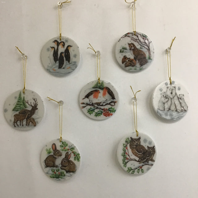 Susan Sitaraman "Animals In Snow" Hanging Ornament On Round White Ceramic Tile (3"W x 1/8"D x 3"H) [Specific Featured Animal(s) Varies]