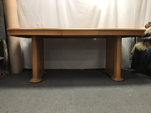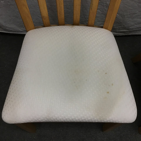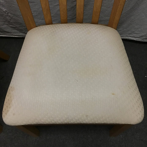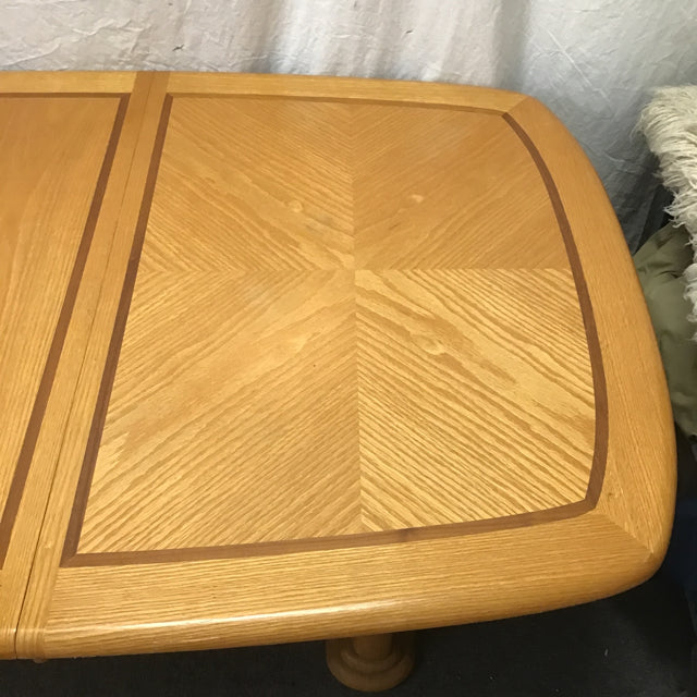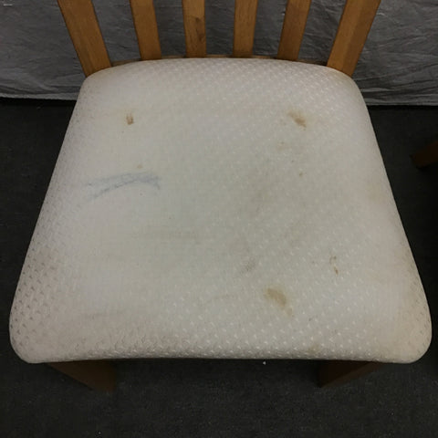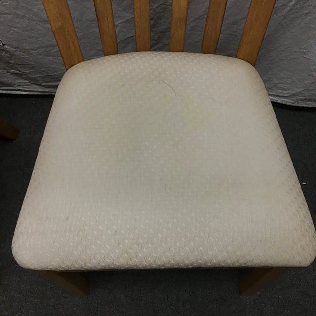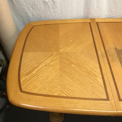 6pc Vintage Solid & Oak Veneer Dining Set: 4x Slat-Back Dining Chairs (Seat: 18"H; 20"W x 20"D x 41"H), & Double Pedestal Expanding Dining Table w/ 18" Leaf [See: Staining on Leaf, Stained Fabric Seats](42"W x 60"/78"L x 30"H)