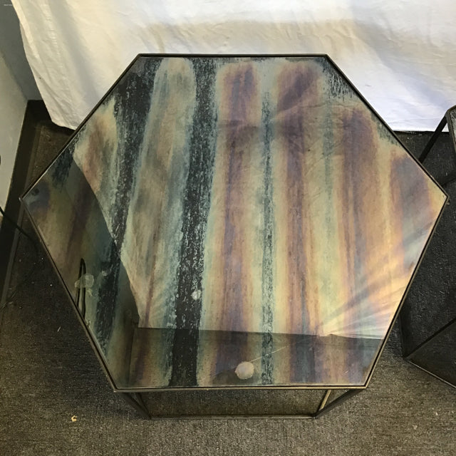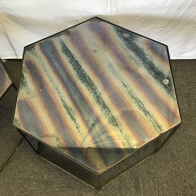 Pair of Modern Iridescent Glass Hexagonal End Tables w/ Black Metal Frames (28"W x 32"D x 18"H)