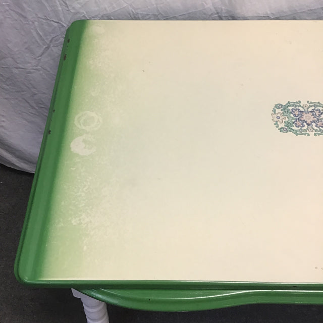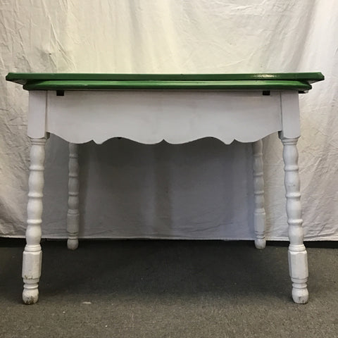 Vintage Farmhouse Green & White Enamel-Top Dining Table w/ Drawer White-Painted Wood Base [See: Missing Draw-Leaf Rails] (41"W x 28"D x 31"H)