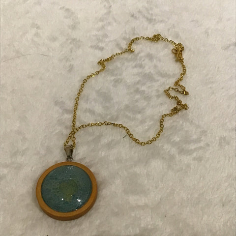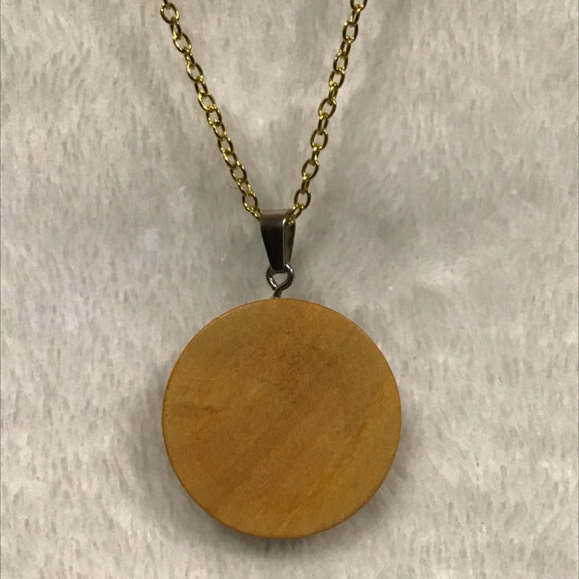 Twin Cat Blue Print in Wood Bezel Necklace on Gold Chain (1" Dia. / 18" Chain)