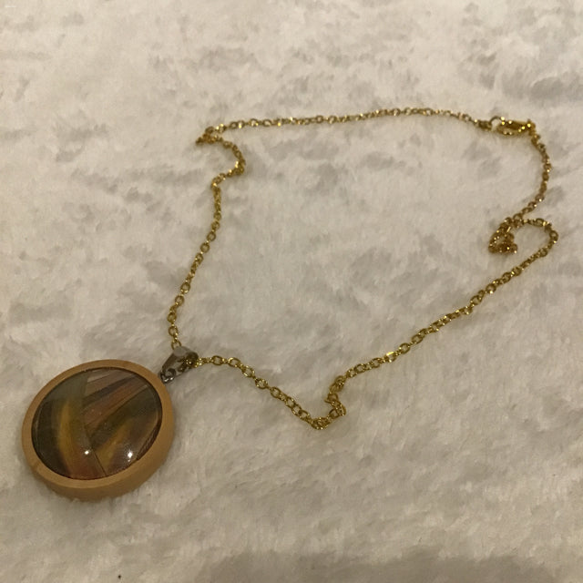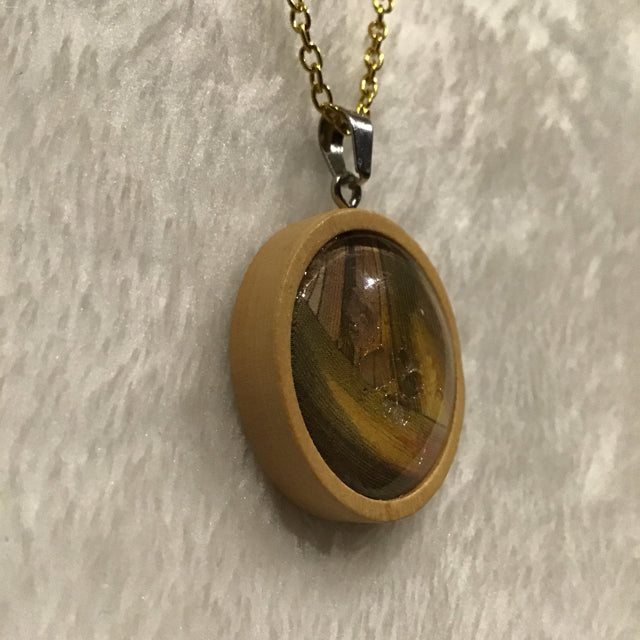 Twin Cat Green Botanical Print in Wood Bezel Necklace on Gold Chain (1" Dia. / 18" Chain)