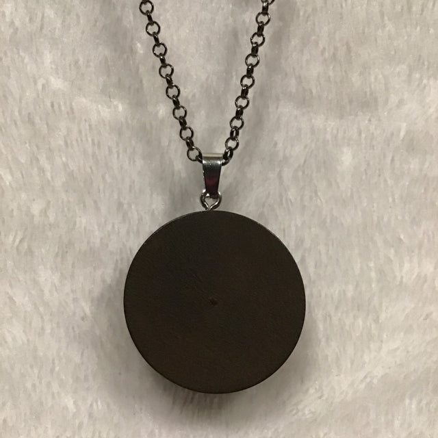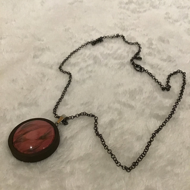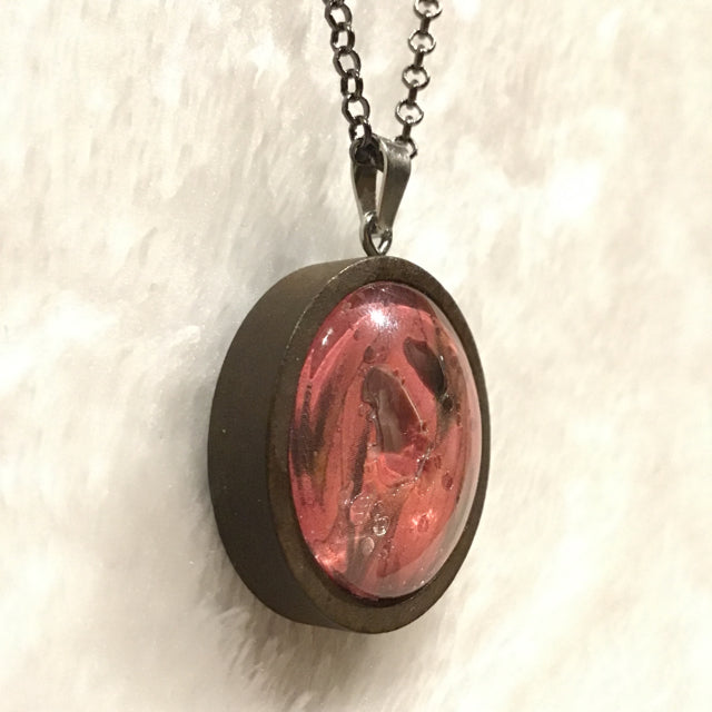 Twin Cat Pink Botanical Print in Dark Wood Bezel Necklace on Dark Metal Chain (1" Dia. / 22" Chain)
