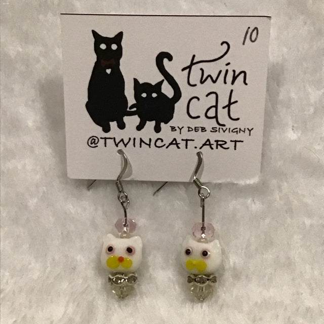 Twin Cat White Cat Dangle Earrings (1 3/4" length from top of hook to base of jewelry)