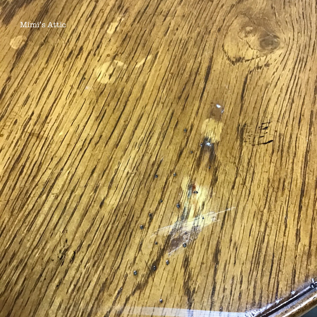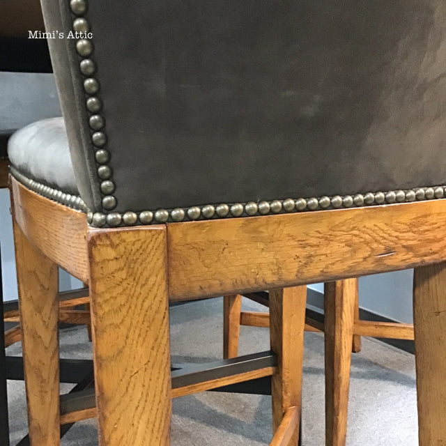 5pc Modern Thomasville Medium-Stained & Black Painted Oak Bar-Height Pub Set: Round Table 4x Brown Suede & Brass Nailhead Stools [See Scratches on Table] (Stool: 20"W x 22"D x 45"H & 30"H Seat) (Tab 38"W x 38"D x 41"H)