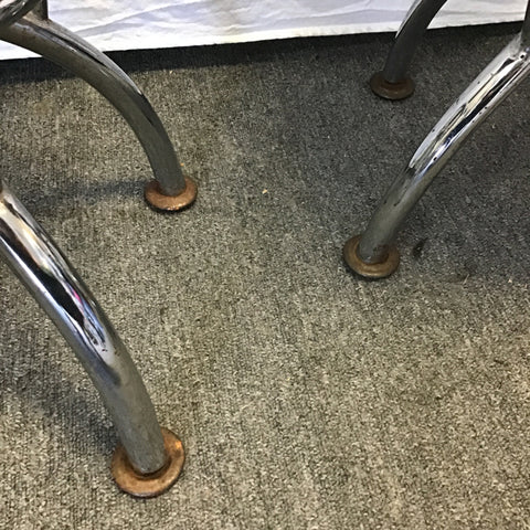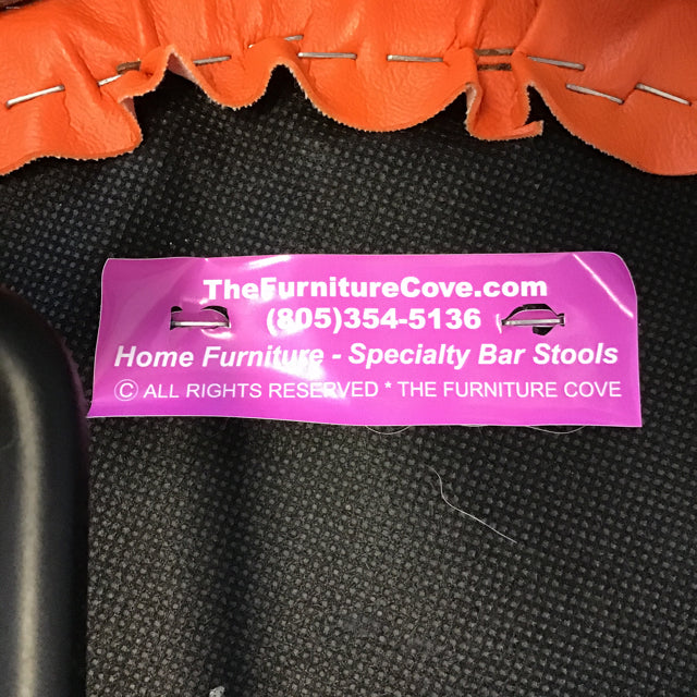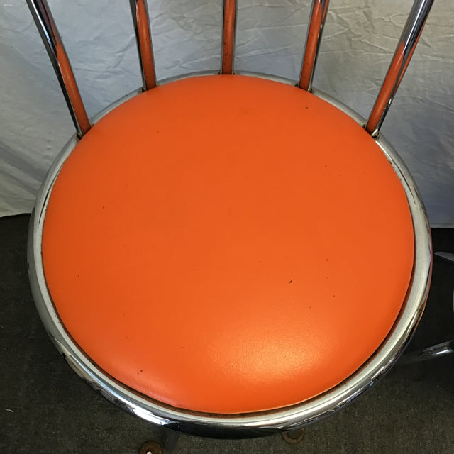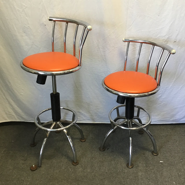 Pair of Modern Atomic Chrome Metal Adjustable Counter/Bar Swivel Stools w/ Orange Vinyl Seats [See: Rust & Missing Screws] [~$360 New!] (Seat: 24"-30"H) (18"W x 17"D x 33"-39"H)