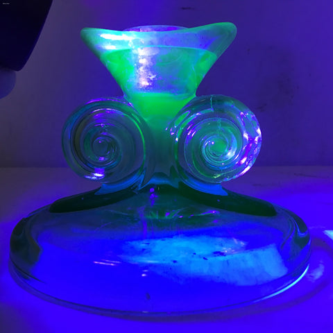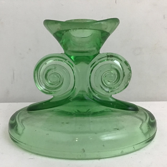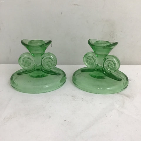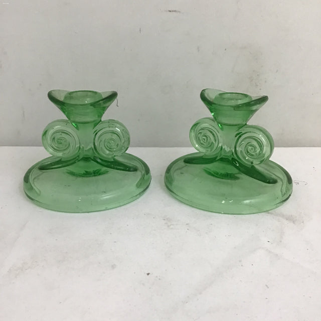 Pair of Vintage Art Deco Fostoria "Versailles" Green Uranium Glass Candle Holders (4.5"W x 3.5"H)